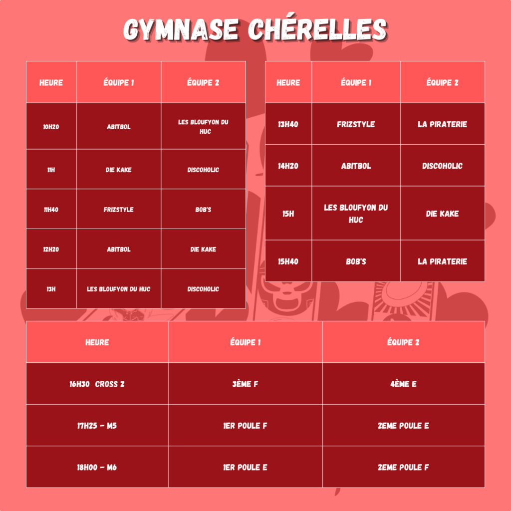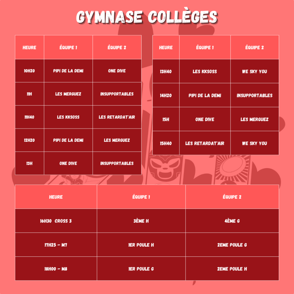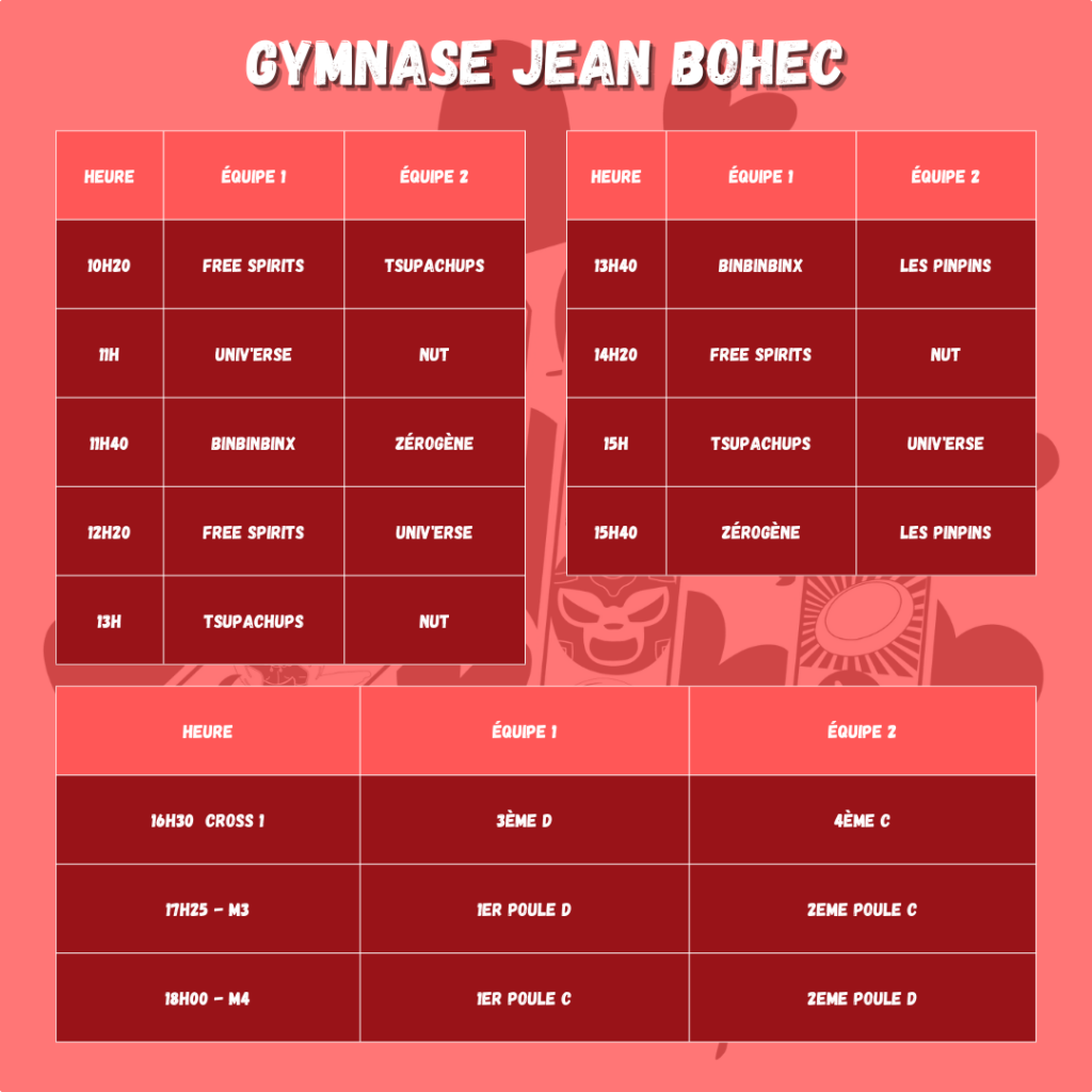 Ouverture des gymnases 45 minutes avant le premier match.